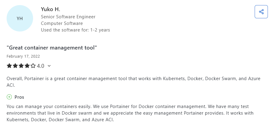Yuko, a senior software engineer, praises how great Portainer works with Kubernetes, Docker, and beyond, and appreciates “the easy management Portainer provides. It works with Kubernetes, Docker, Docker Swarm, and Azure ACI.”