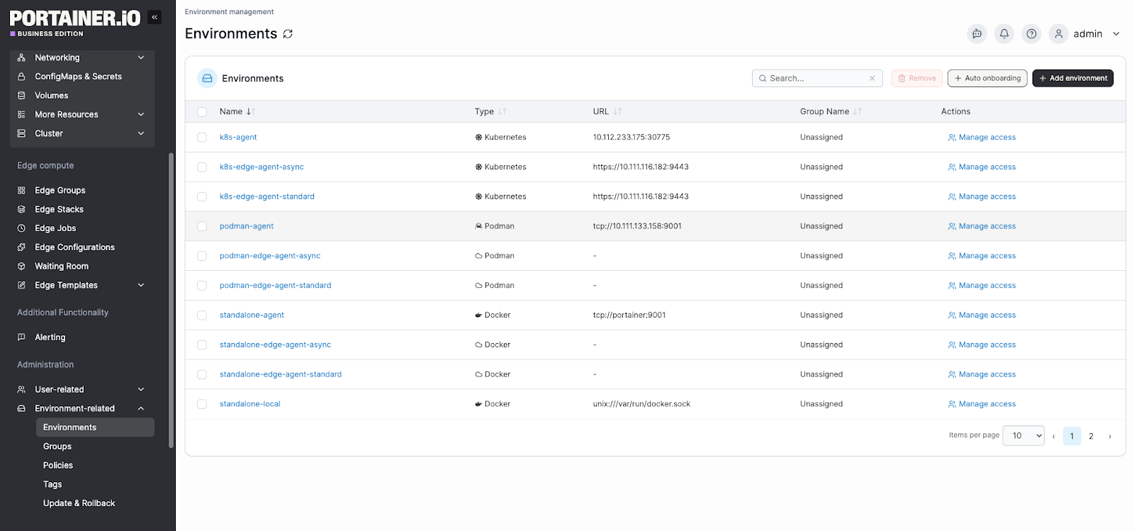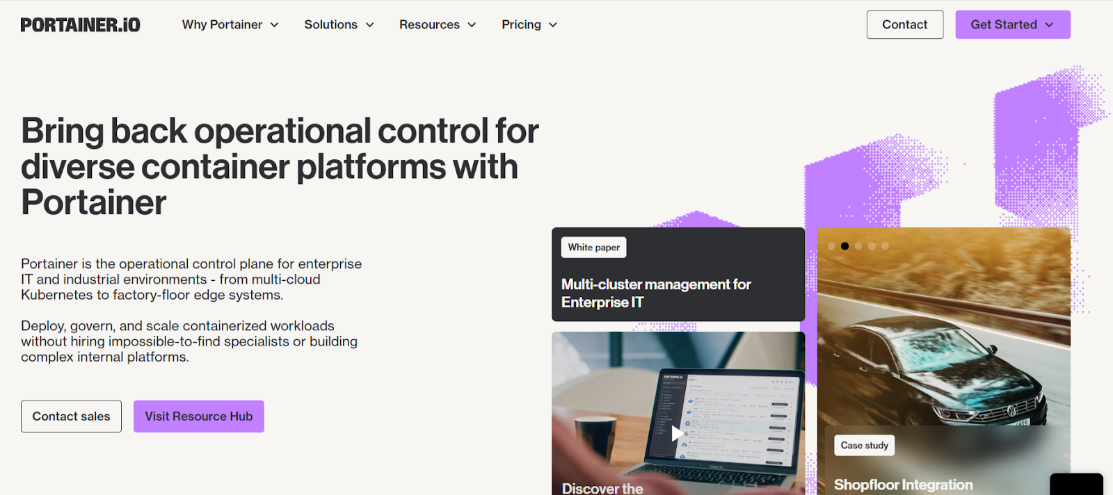 Portainer integrates with Docker, Kubernetes, and edge clusters through a single interface.