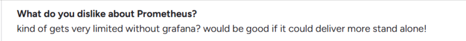 - No built-in visualization: Requires tools like Grafana for dashboards. Many users often mention that Prometheus alone does not provide in-depth UI dashboards.