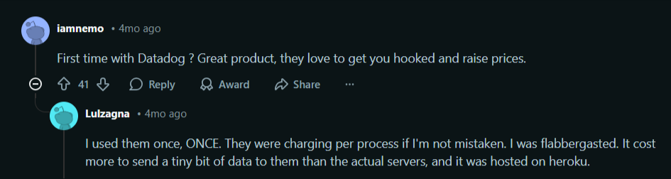 - Cost at scale: Datadog charges per host, per container, and per feature, so bills rise quickly as environments grow. Many teams running hundreds of containers regularly report significant cost increases due to high-cardinality metrics and log ingestion. Reddit users regularly warn about cost growth in production clusters.
