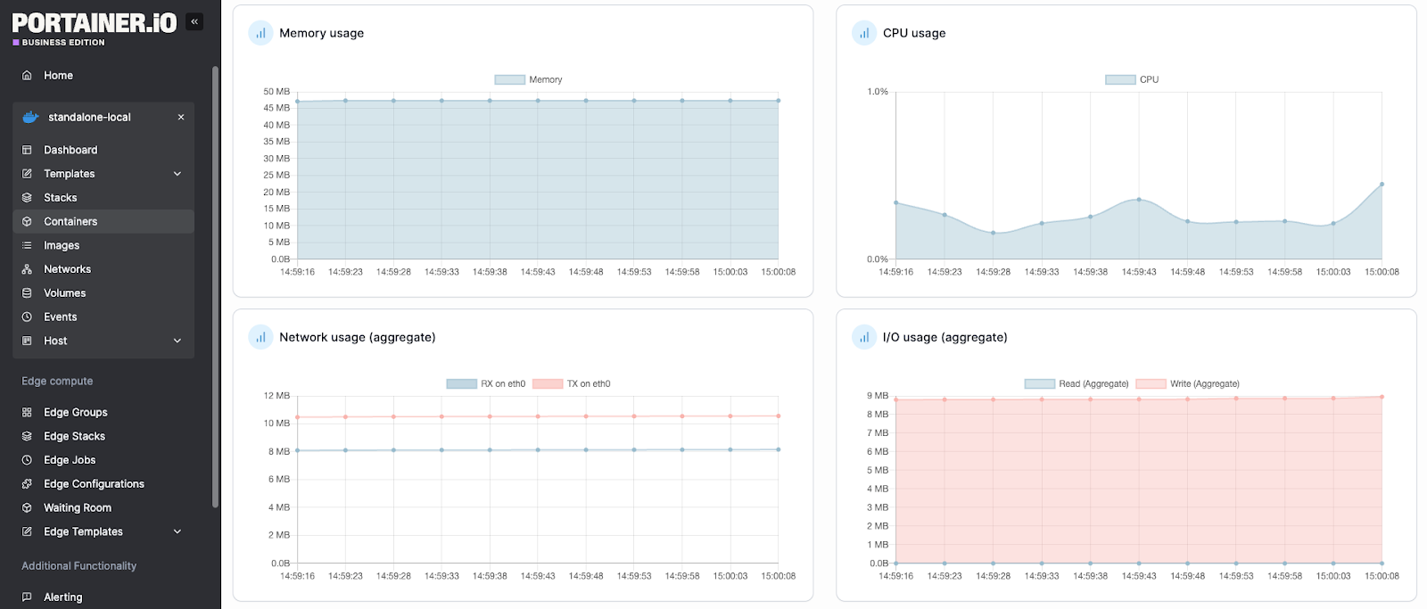 Portainer doesn’t replace full observability stacks. Instead, it provides built-in container monitoring and health visibility within the same platform you already use for container management. That reduces context switching and infrastructure overhead.