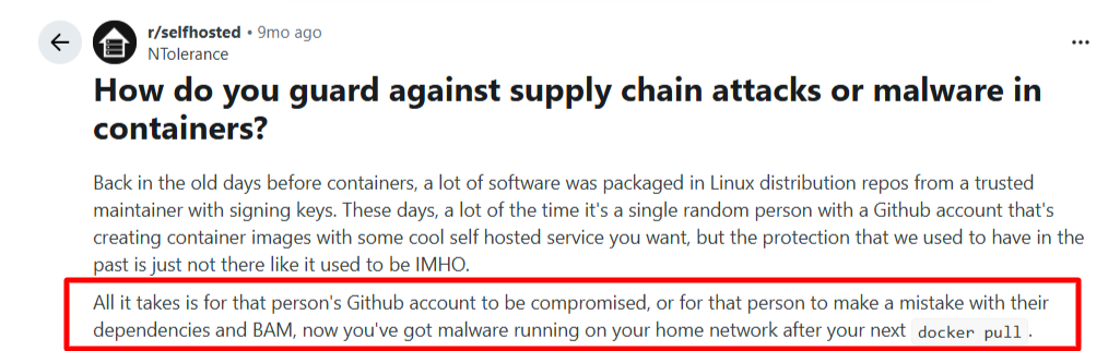 A Redditor shared how a crypto miner attacked their workloads through a vulnerable node.js base image. This security breach cost them thousands of dollars to rectify, plus lost productivity.
