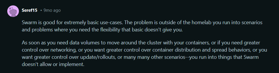 A Redditor explicitly mentioned that Docker Swarm's basic features can't handle complex container orchestration tasks.
