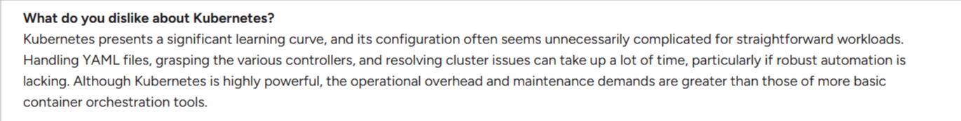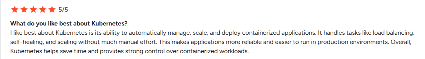 "What I like most about Kubernetes is how powerful it is for managing containerized applications at scale. It automates deployment, scaling, and load balancing, which takes a lot of manual work off the team. Once everything is set up, it's very reliable and makes it easier to keep applications running smoothly even as demand changes." G2 reviewer.