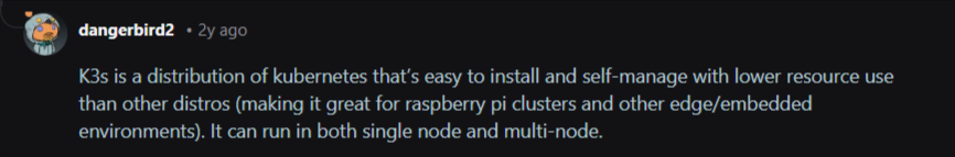 "K3S is pretty easy to setup. It's also not very difficult to bootstrap it via Ansible. The challenge is mostly with configuration." Redditor