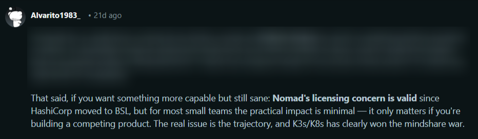 A Redditor shared, "I was looking at Nomad for its simplicity, but its licensing model does not make me 100% confident about its future. Besides, it does not seem to gain traction these days."