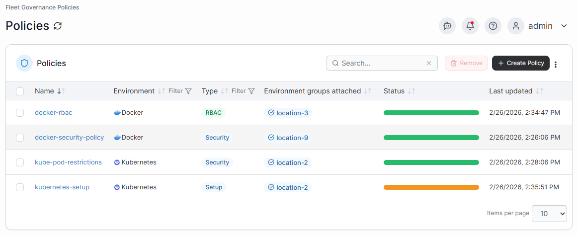 Additionally, environments that are running the Portainer agent use a polling process to check back with the Portainer server and remediate drift from the intended state. So even if an important security policy is manually removed from the environment, the agent will detect this and reinstall the policy automatically.