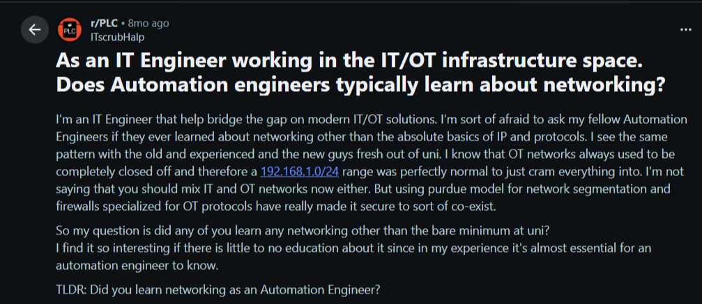 Recently, a Redditor noted that automation engineers often lack networking knowledge beyond the basics, creating gaps in the management of IoT-integrated systems, such as PLCs and SCADA systems, in manufacturing.
