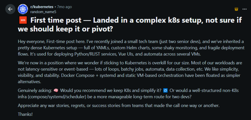 Misconfigurations often cause subtle failures that are hard to diagnose. One Reddit post captures this frustration as teams wrestle with dense, fragile configs that feel overwhelming for small teams.