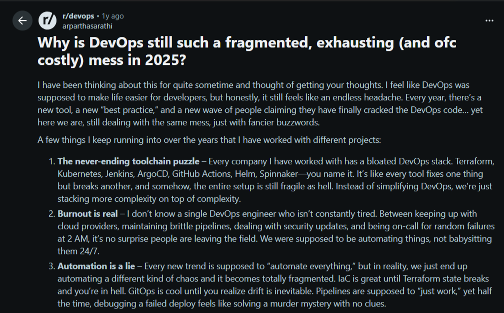 Here’s the reality: Most engineers just want a clear, unified context during incidents, but toolchain sprawl makes that difficult. This Reddit post validates this fact.