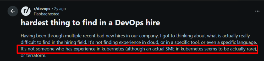 A Redditor also affirmed how rare it is to find someone with subject-matter expertise in Kubernetes.