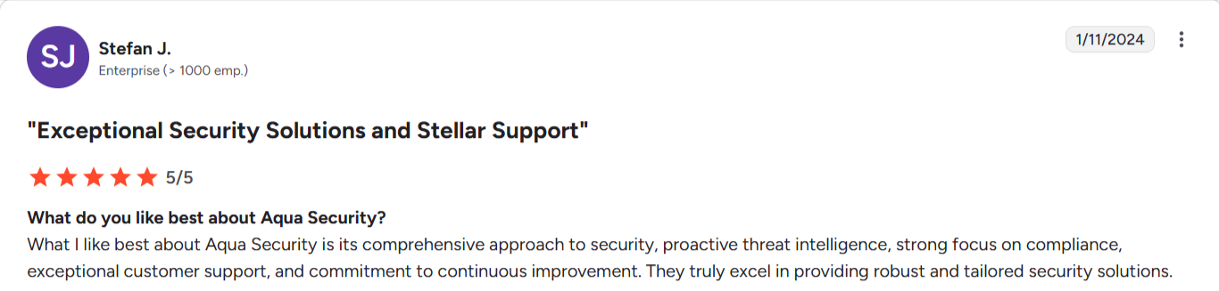 - Broad security coverage: Aqua addresses build-time, deployment-time, and runtime risks on a single platform.