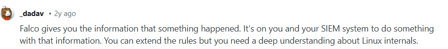 - Limited prevention: Falco detects threats but does not block actions by default, so the response still relies on human or external tooling.