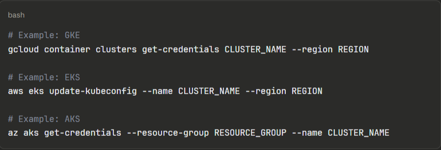 Once your cluster is running, download the kubeconfig file directly from your provider’s console or CLI: