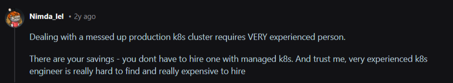 In response to the Reddit thread, a user shared the reality of the scarcity and high cost of hiring an experienced Kubernetes expert.