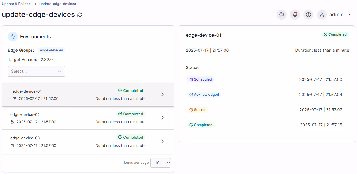 This release sees an overhaul of the Update & Rollback functionality for Edge devices. We've refreshed the UI and expanded the schedule detail view to provide much more information including per-device status reports so you can confirm that all devices in the group were updated as expected.
