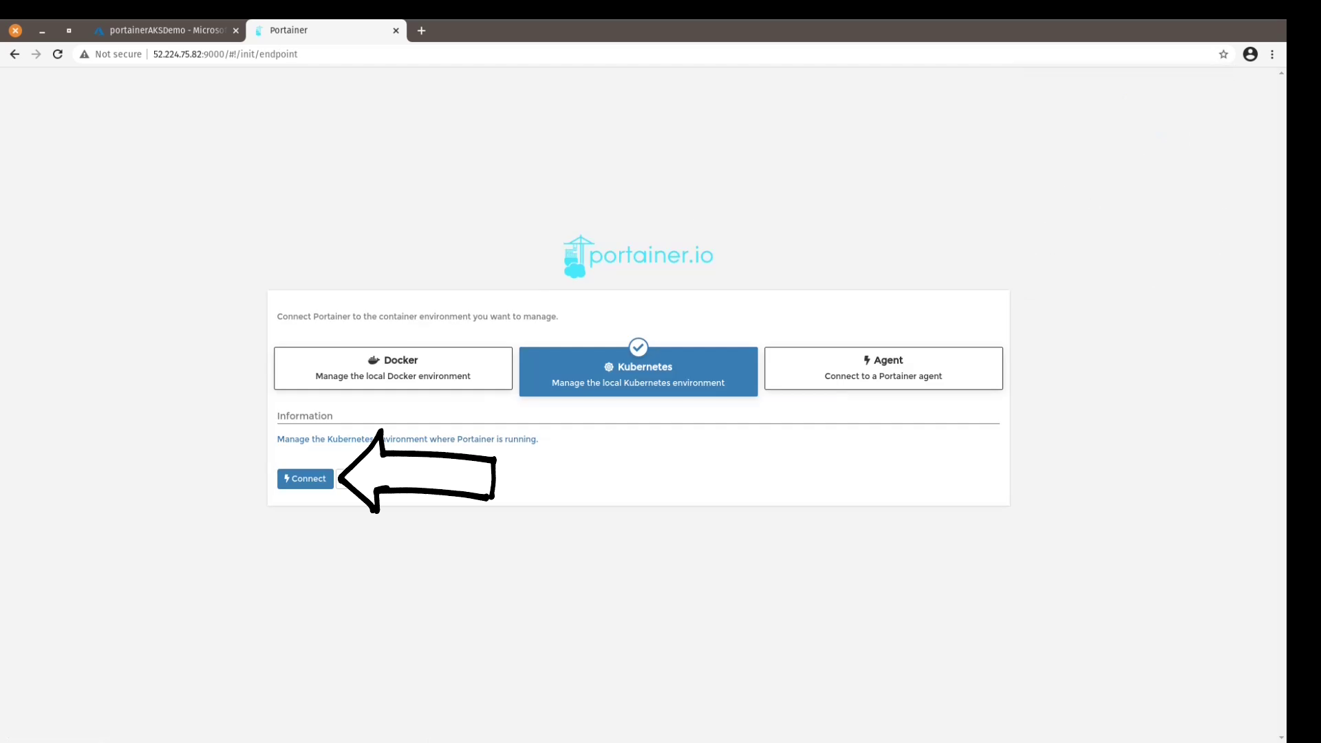 - Connect Portainer to the Kubernetes environment by clicking the Connect button. You will notice that Kubernetes is already pre-selected: