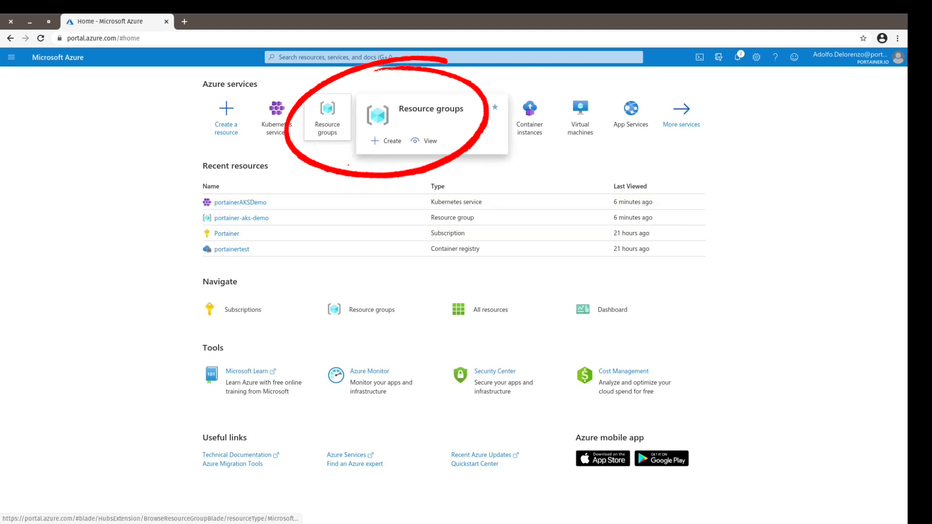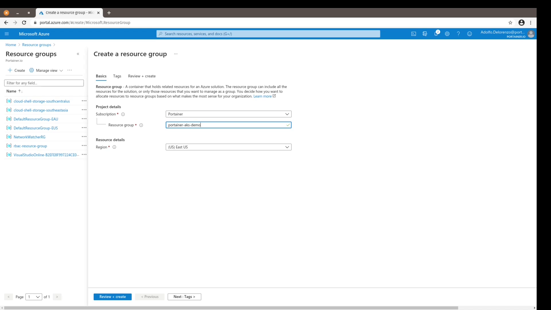 - Let's start by creating a Resource Group on the Azure Portal. For the purpose of this exercise I called the resource group portainer-aks-demo. Make sure to select the Region that best suits you. :
