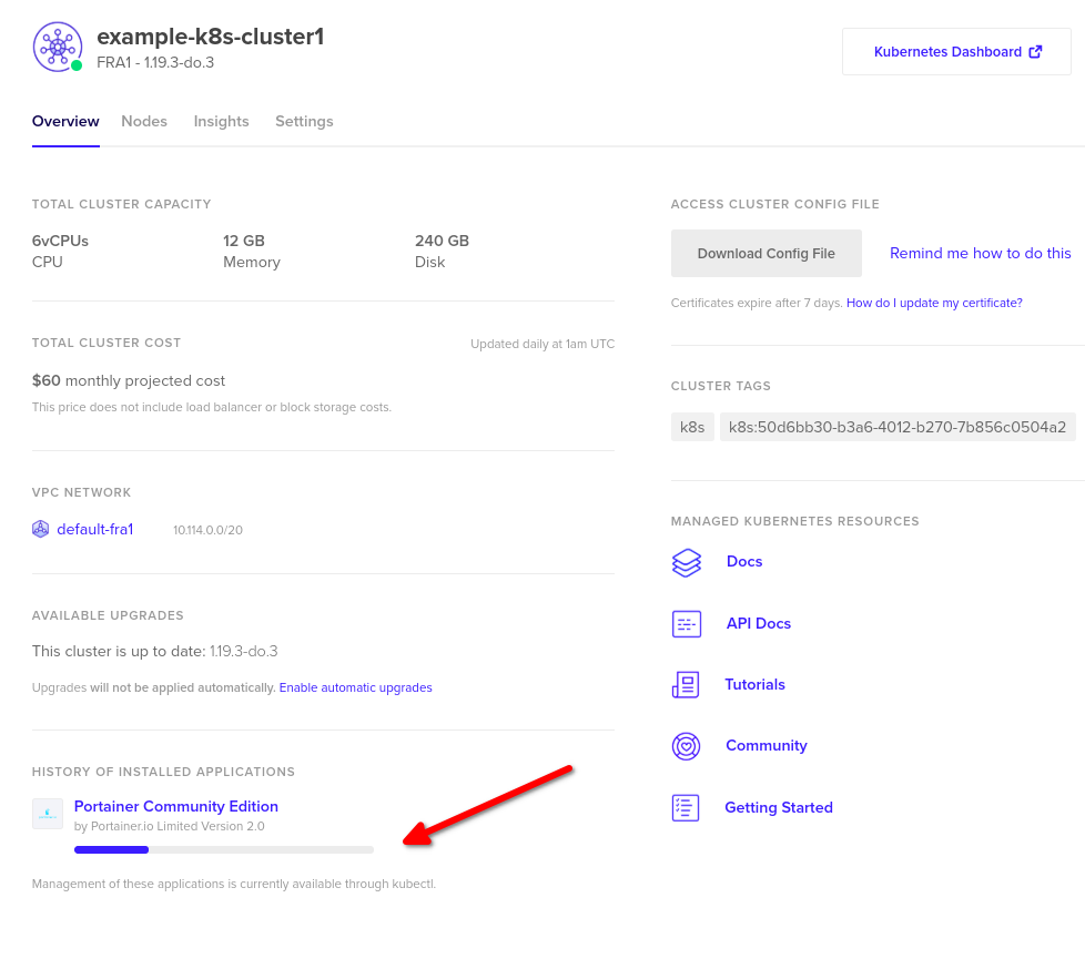 - You will notice that the new cluster is being deployed with Portainer CE pre-installed: