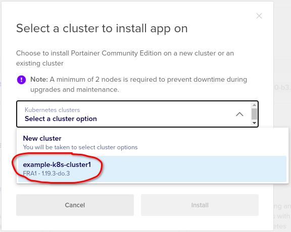 - A pop-up dialog box will come up where you can select the Kubernetes Cluster where you want to deploy Portainer and click on Install: