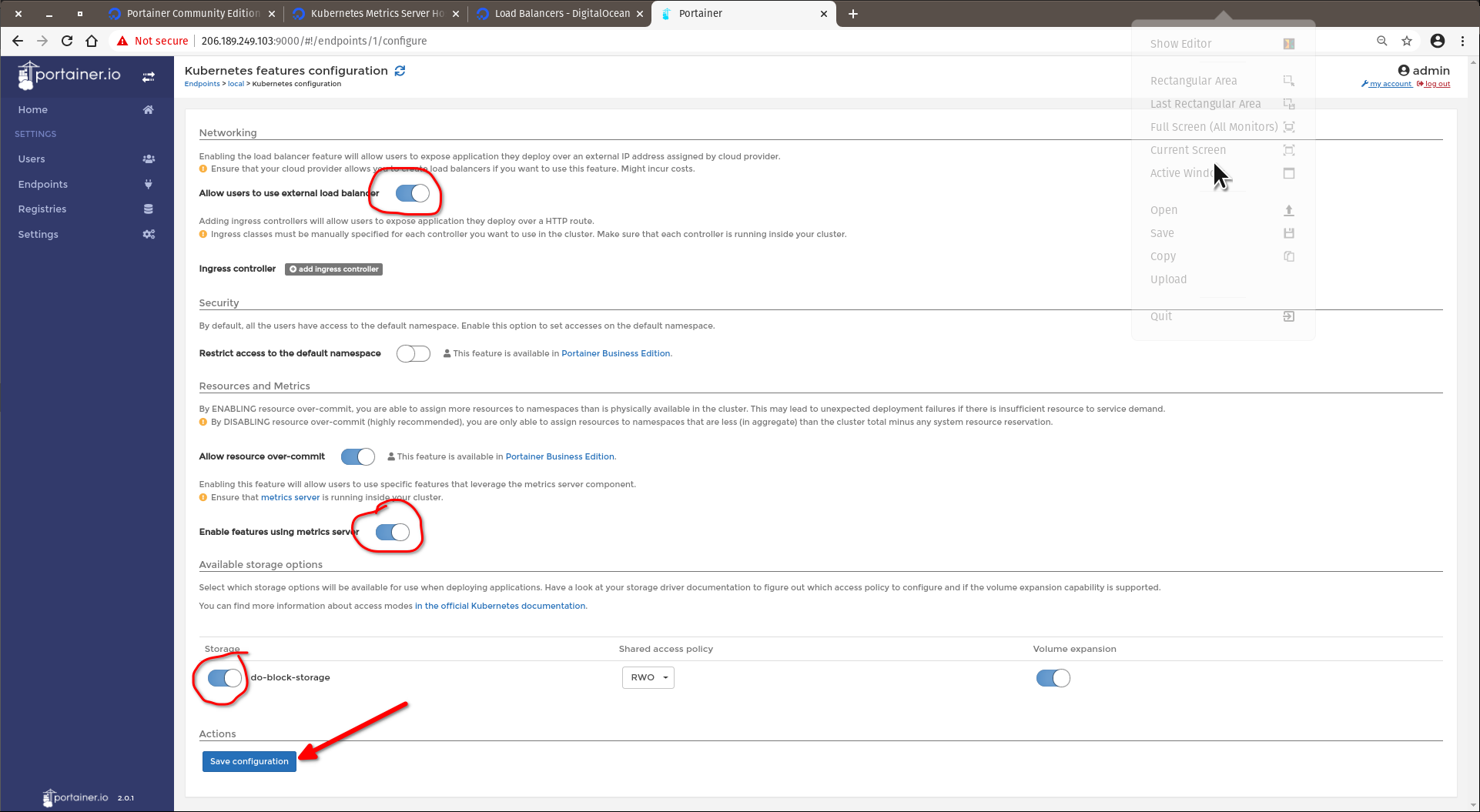- The final last step of the Portainer settings are to select the options below and click on Save configuration: