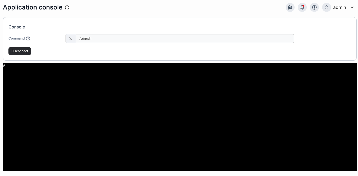 A browser-based shell session opens directly into the container.