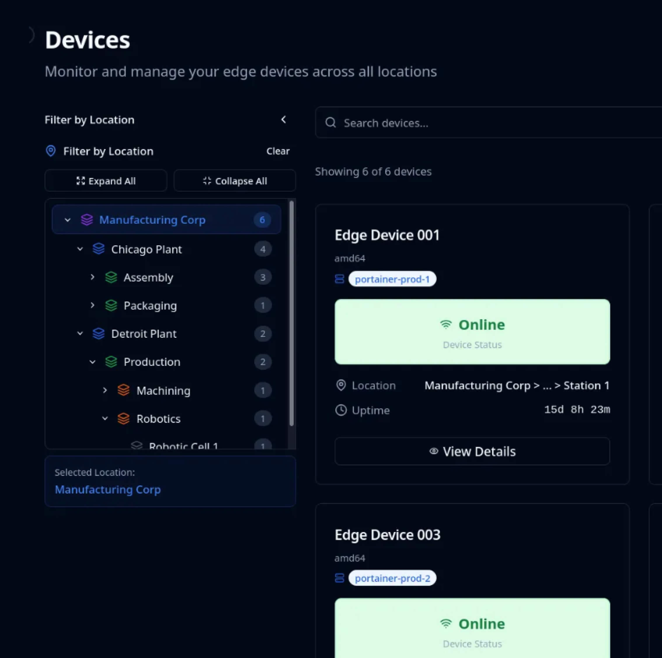 The Portainer Industrial App Portal removes that burden by speaking the language of the plant itself. It presents environments as sites, lines, and devices, and applications simply as the tools that keep those environments running. There is no need to understand how workloads are packaged or orchestrated behind the scenes; operators interact only with the constructs they recognize, and the underlying complexity disappears into the background where it belongs.
