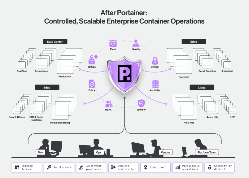 By consolidating governance, access, deployment, and fleet operations into a single system, Portainer shifts container platforms from engineering projects into managed operational systems that directly serve business requirements — without any overhead or toil.